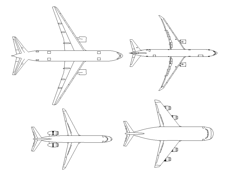 Top views of the airplanes are given in this AutoCAD model. There are four different types of airplanes are given. Top views of the air planes are given. For more details download the AutoCAD drawing file. Thank you for downloading the AutoCAD drawing file and other CAD program files from our website.