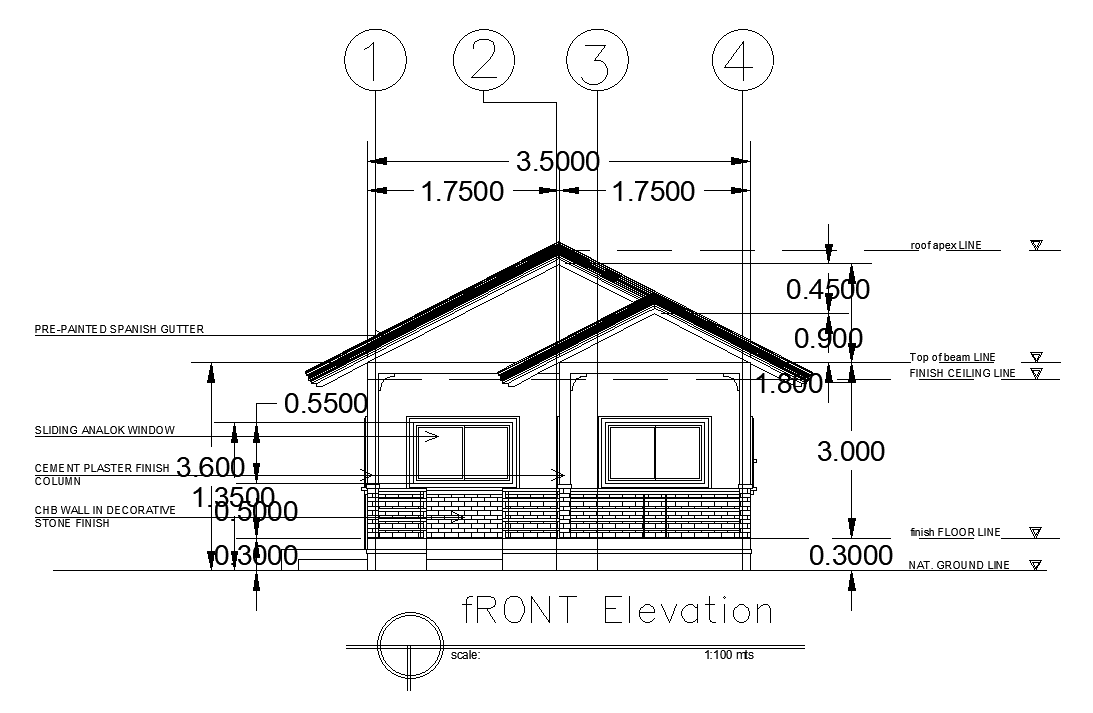 Front elevation view of 7x13m residential building is given in this AutoCAD drawing model.Download now.