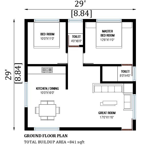 29'X29' single floor sloping roof house design is given in this cad file. The total built-up area of the plan is 841 sqft. On this floor plan, a master bedroom with an attached toilet, a great room, bedroom, common toilet, and a kitchen with dining is available. Download the free 2D Autocad drawing file.