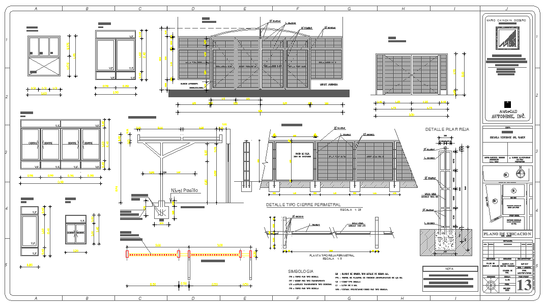 boundary wall main gate design. plan & elevation & section detail include the file.detail type peri metral closure, new perimetral, detail of foundation, cross-section,