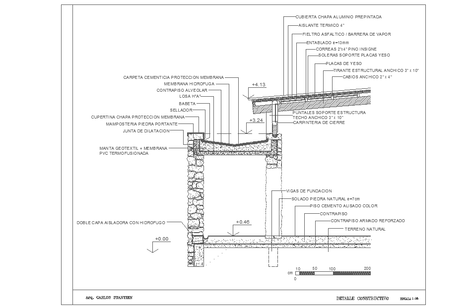 Detail connection roof with stone wall design. cement membrane, punts support structure ceiling roof 3 "x 10", structural anchor strap 3 "x 10", colored floor cement floor, double isolated coating with hydrolic cover.