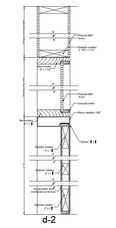 Longitudinal section view of the 2100x800mm door structure is given in this AutoCAD drawing model.Download now.