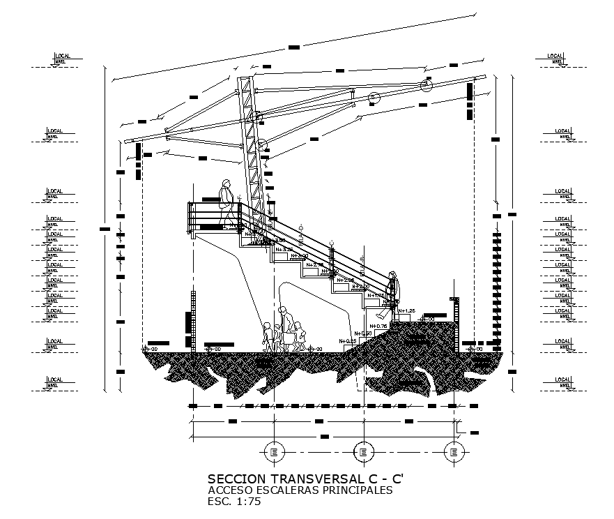 Transverse section CC view of 50x46m shopping mall staircase is given in this AutoCAD drawing model.Download now.