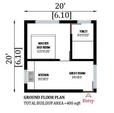 20’x20’ house plan has been given in this AutoCAD 2D drawing model. Total built up area is 400 SQFT. This is ground floor plan. Great room, master bedroom with attached toilet, and kitchen are available on this plan. Other details are given on this plan. Download the AutoCAD drawing file. Thank you for downloading the AutoCAD and other CAD program files from our website.