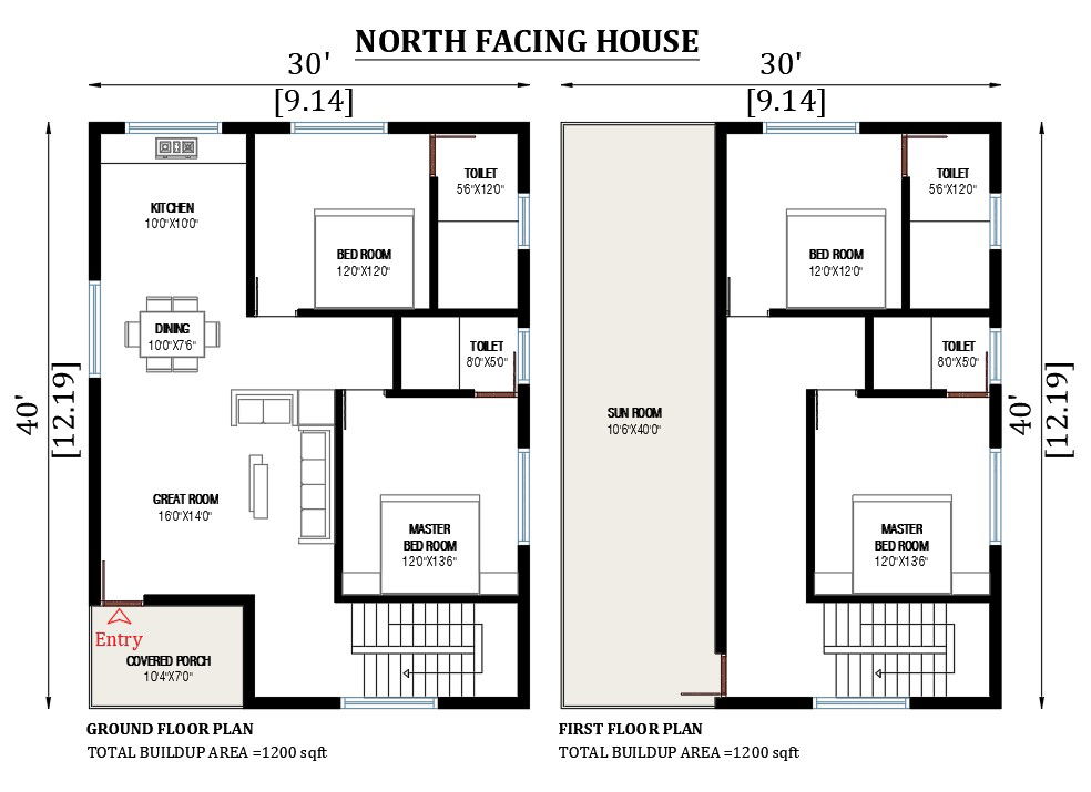 30'x40' north facing house plan as per Vastu shastra is given in this 2D Auto cad drawing file. The total area of the house plan is 1200 sqft. This is a ground floor plan there is a Master bedroom with an attached bathroom, a bedroom with an attached bathroom, a great room, kitchen, dining area, and covered porch are available. and on the first floor, there is a Master bedroom with an attached bathroom, a bedroom with an attached bathroom, and a sunroom is available. Download the AutoCAD drawing file.