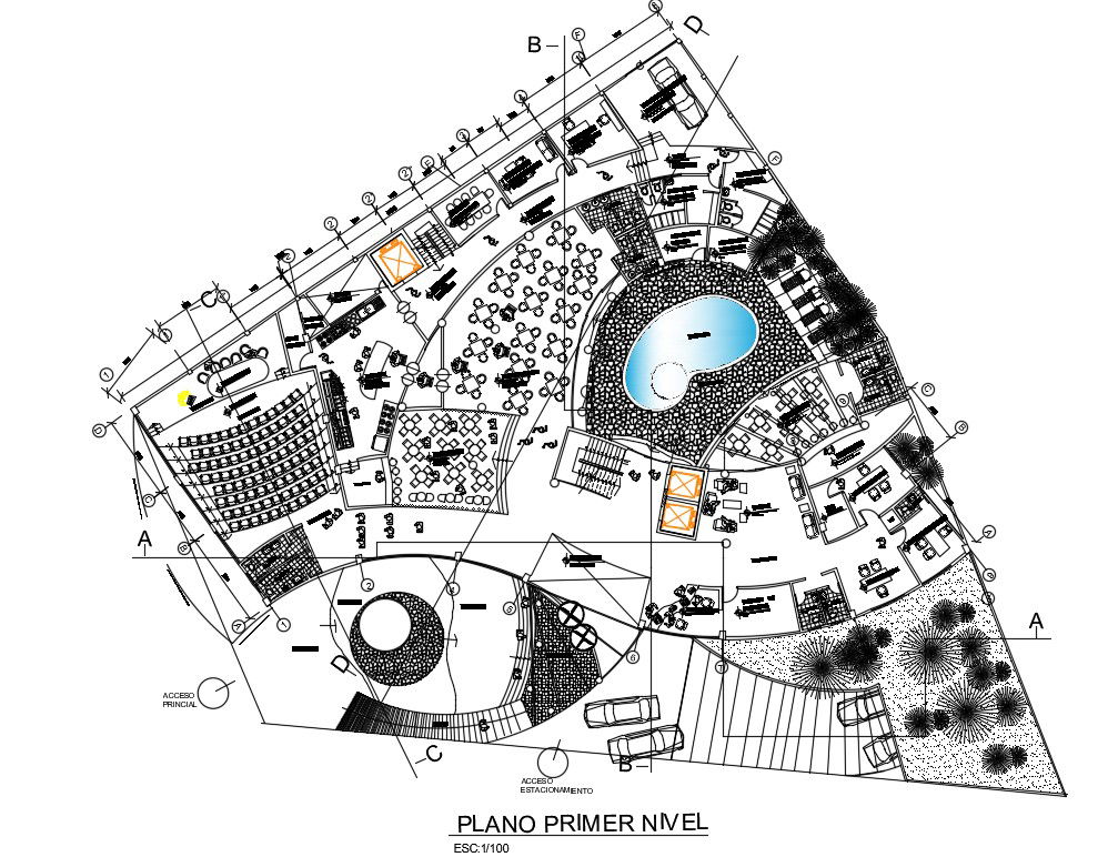46x40m hotel cum multi functional first floor plan is given in this Autocad drawing file. This is G+6 hotel building. Swimming pool, restaurant, lobby bar, vestidor, garden, auditorium, kitchen, service area, cafeteria, patio, corridor, administrative office, secretary room, gent’s toilet, ladies toilet, and other details are given in this model. For more details download the Autocad drawing file. Thank you for downloading the Autocad drawing file and other CAD program files from our cadbull website.