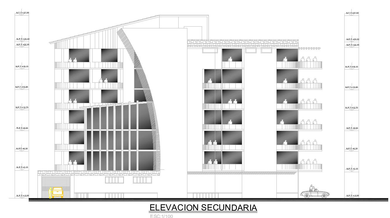 Left side elevation view of 46x40m hotel cum multifunctional building is given in this Autocad drawing file. This is G+6 hotel building. Staying room, dining area, swimming pool, restaurant, lobby bar, vestidor, garden, auditorium, kitchen, service area, cafeteria, patio, corridor, administrative office, secretary room, gent’s toilet, ladies toilet, and other details are given in this model. For more details download the Autocad drawing file. Thank you for downloading the Autocad drawing file and other CAD program files from our cadbull website.