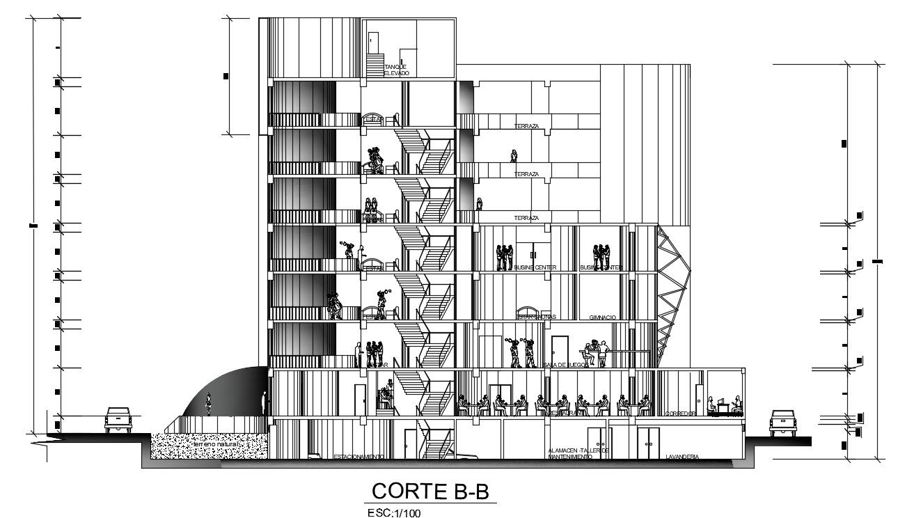 Right side section view of 46x40m hotel cum multifunctional building is given in this Autocad drawing file. This is G+6 hotel building. Staying room, dining area, swimming pool, restaurant, lobby bar, vestidor, garden, auditorium, kitchen, service area, cafeteria, patio, corridor, administrative office, secretary room, gent’s toilet, ladies toilet, and other details are given in this model. For more details download the Autocad drawing file. Thank you for downloading the Autocad drawing file and other CAD program files from our cadbull website.
