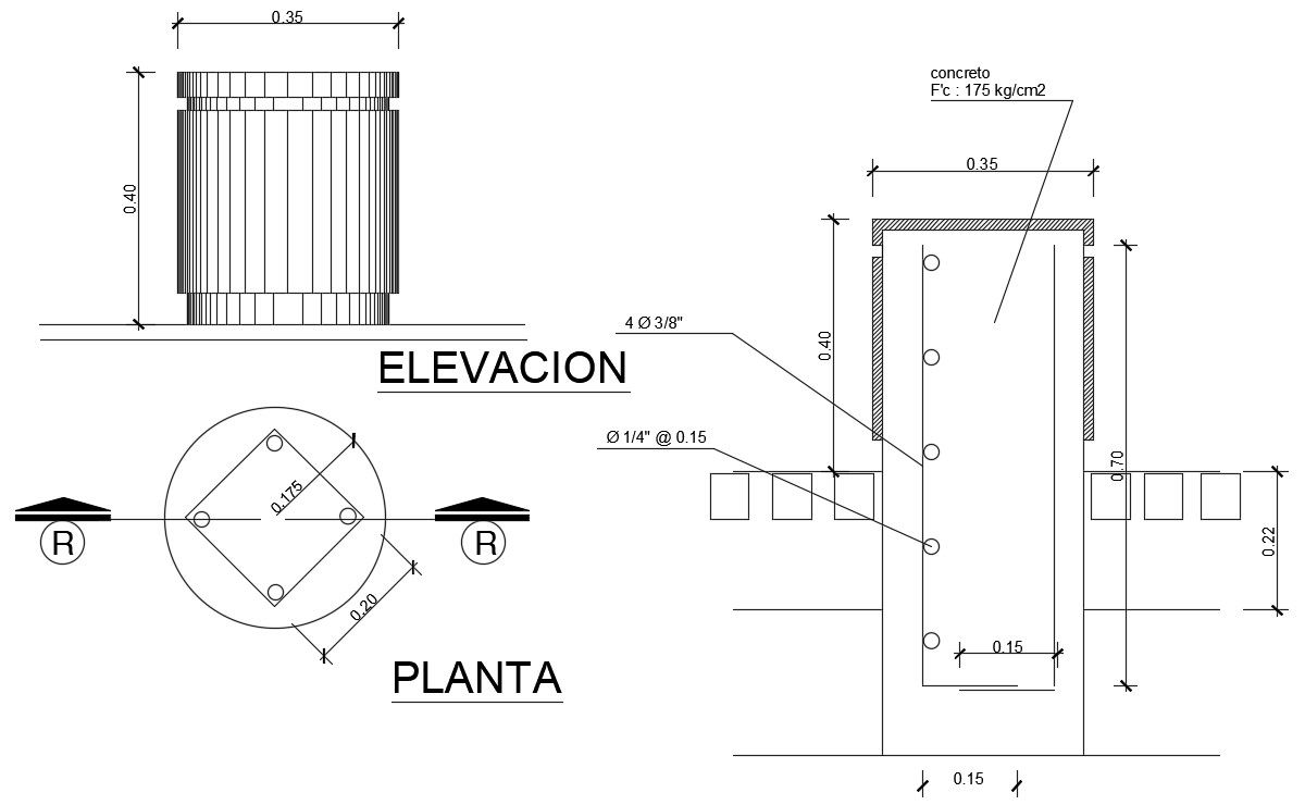 An elevation view of the 0.40m cylinder structure has been given in this AutoCAD model. Reinforcement details are specified clearly in this model. For more details download the AutoCAD drawing file. Thank you for downloading the AutoCAD drawing file and other CAD program files from our cadbull website.