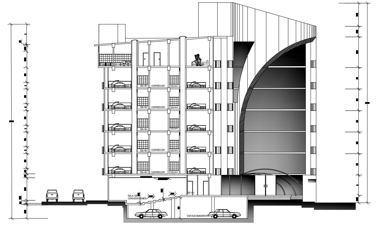 Left side section view of 46x40m hotel cum multifunctional building is given in this Autocad drawing file. This is G+6 hotel building. Staying room, dining area, swimming pool, restaurant, lobby bar, vestidor, garden, auditorium, kitchen, service area, cafeteria, patio, corridor, administrative office, secretary room, gent’s toilet, ladies toilet, and other details are given in this model. For more details download the Autocad drawing file. Thank you for downloading the Autocad drawing file and other CAD program files from our cadbull website.