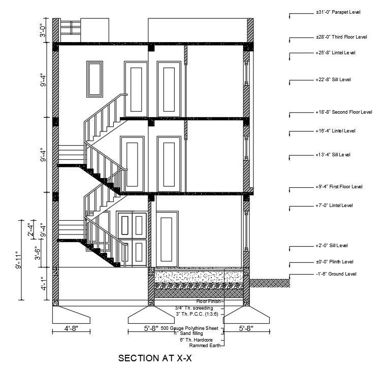 A section view of the 24’x38’ house building is given in this AutoCAD drawing model. This is G+ 2 house building. A kitchen, dining area, bedroom, store room, common bathroom, guest room, and open terraces are available. The master bedroom with attached bathroom, two guest room, kid’s room, living room, and open terraces are available on the second floor. For more details download the AutoCAD drawing file. Thank you for downloading the AutoCAD drawing file and other CAD program files from our website.