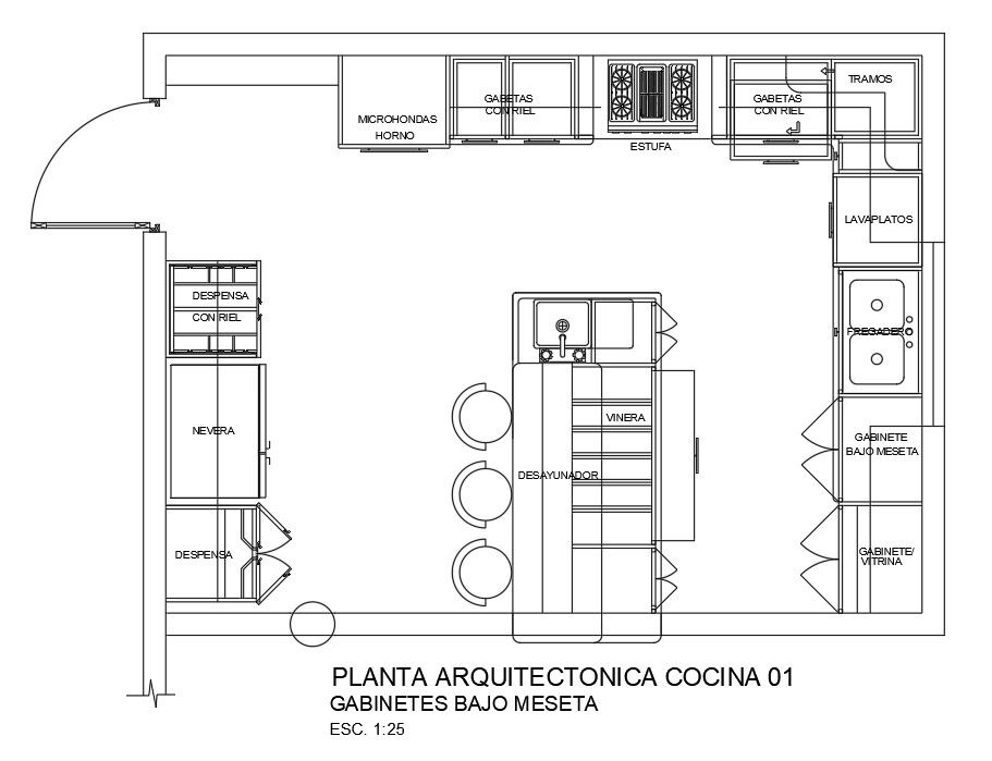 5.4x4m kitchen plan is given in this AutoCAD drawing model. Total height of the kitchen is 3m. Microwave oven, drawers with rail, stove, sections, dishwasher, sink, breakfast table, wine tank, cabinet under plate, and other details are mentioned. For more details download the AutoCAD drawing file. Thank you for downloading the AutoCAD drawing file and other CAD program files from our website.
