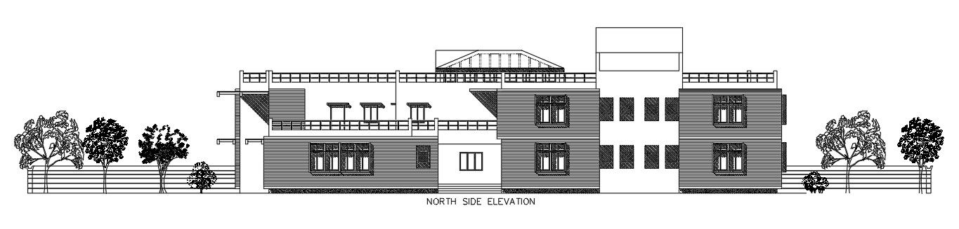 The north side elevation view of the 57x23m luxury villa building is given in this AutoCAD drawing model. Download now.