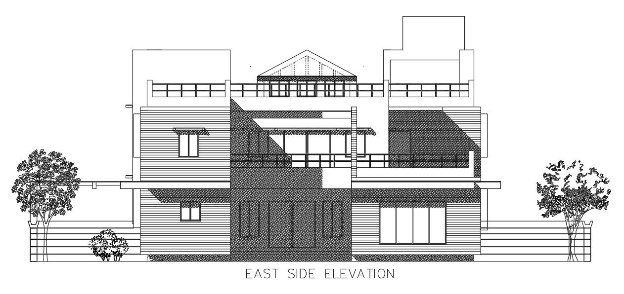 The east side elevation view of the 57x23m luxury villa building is given in this AutoCAD drawing model. Download now.