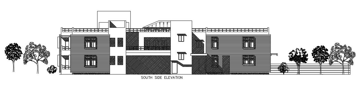 The south side elevation view of the 57x23m luxury villa building is given in this AutoCAD drawing model. Download now.