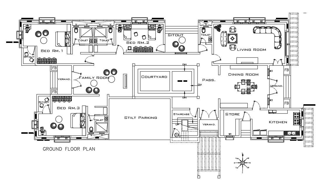 Furniture’s layout of 57x23m ground floor luxury villa plan is given in this AutoCAD drawing model. This is G+ 1 villa building. A court yard, car parking, family room, dining room, store room, kitchen, living room, sit out, guest room with attached bathroom, master bedroom with attached bathroom, guest room with attached bathroom, garden, and common bathrooms are available. For more details download the AutoCAD drawing file. Thank you for downloading the AutoCAD drawing file and other CAD program files from our website.