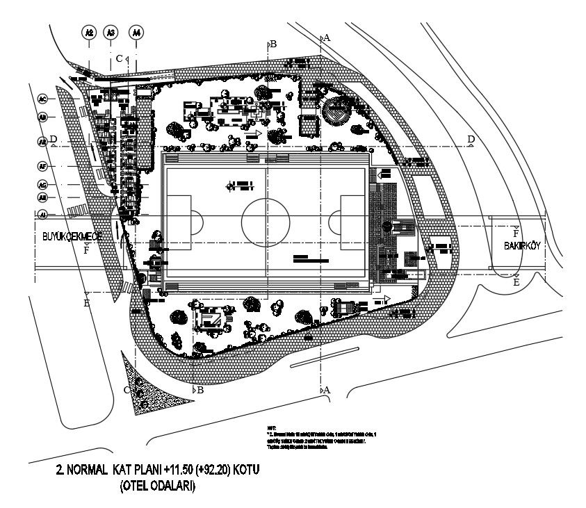 171x142m hotel plan of basketball court plan is given in this AutoCAD drawing model. Download now.