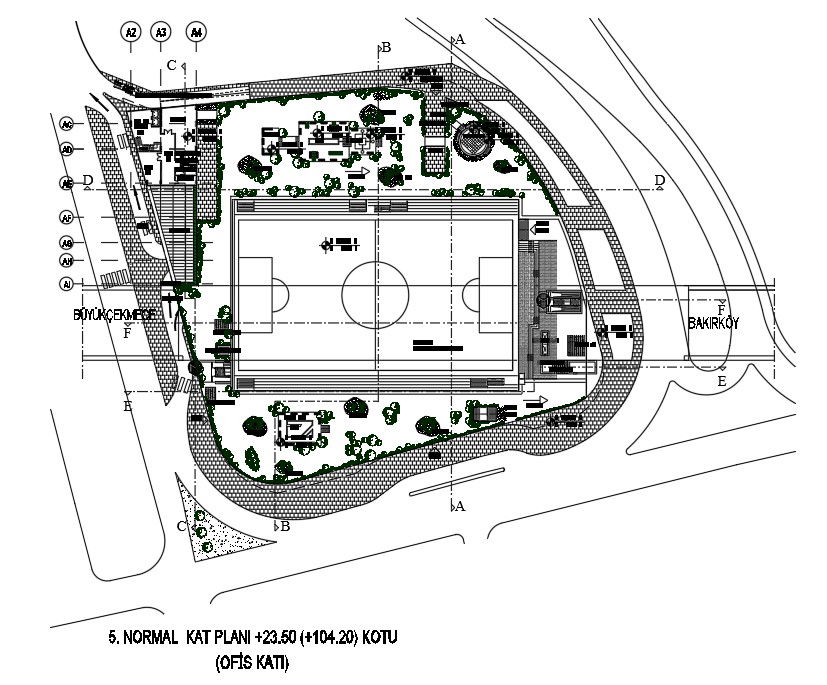 The marking line of 171x142m hotel plan of basketball court plan is given in this AutoCAD drawing model. Download now.