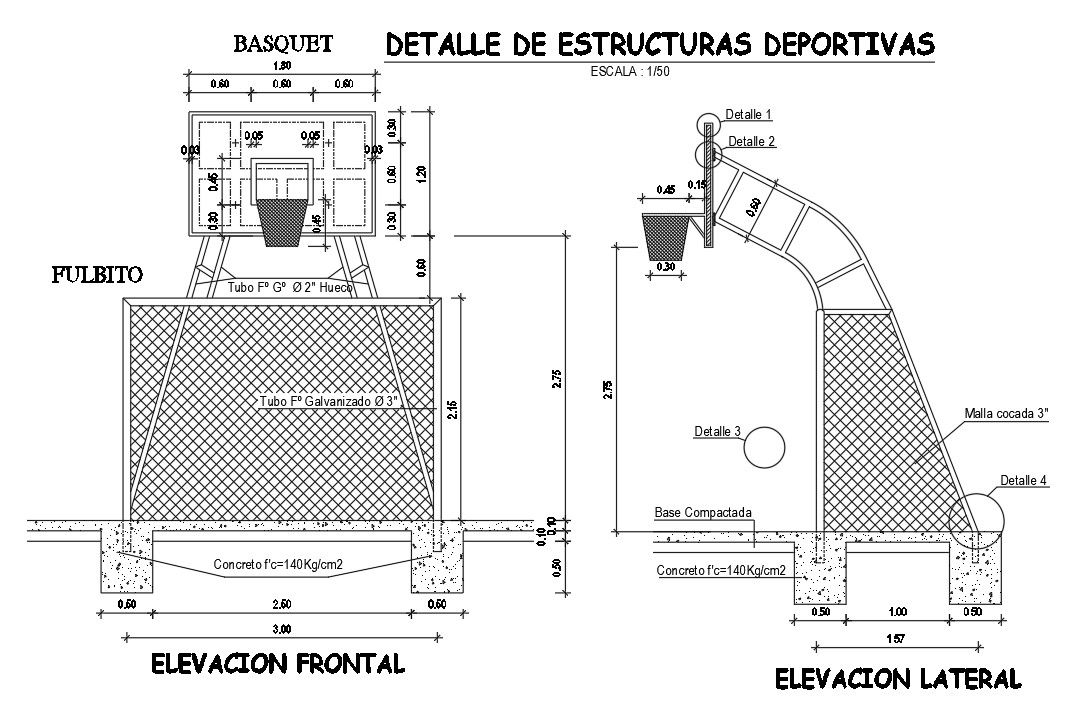 The front elevation view of the 35x25m multi sports complex plan of basketball is given in this AutoCAD drawing model. Download now.