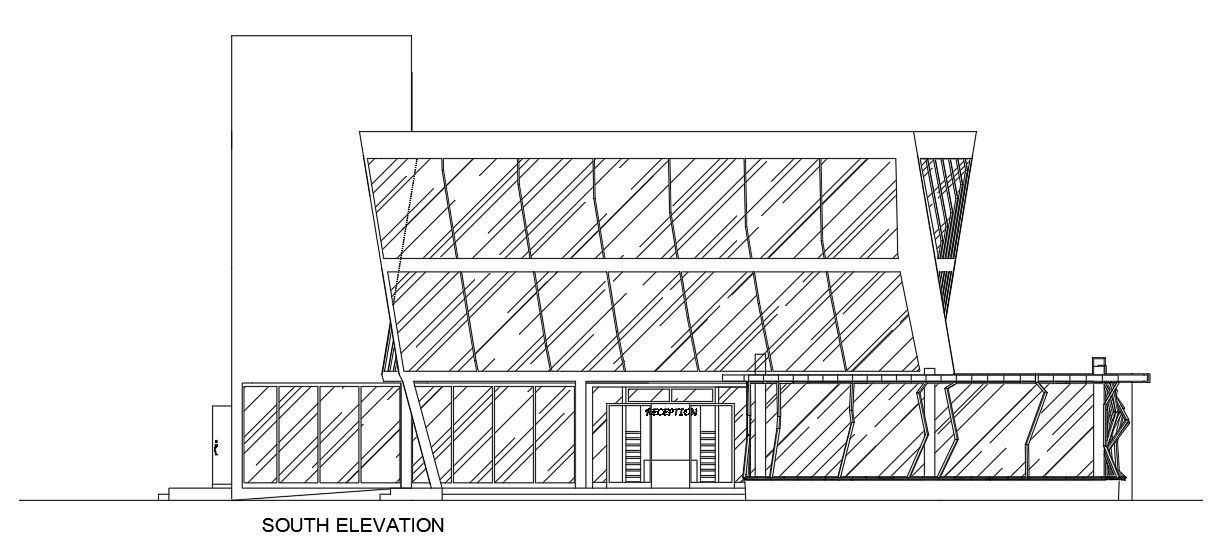 The south side elevation view of the 25x20m commercial building is given in this AutoCAD drawing model. Download now.