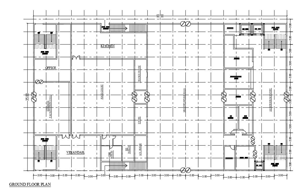 60x35m engineering college auditorium first floor plan is given in this AutoCAD drawing model. Download now.