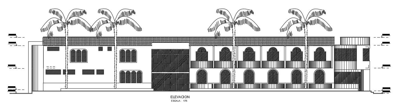The front elevation view of the 40x12m hostel building is given in this AutoCAD drawing model. Download now.