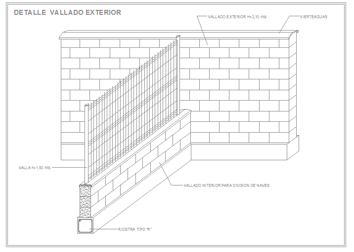 exterior wall fence design. exterior fence h = 2,10 mts, interior fenced for division of ships, riostra type "r", valla h = 1.50 mts.
