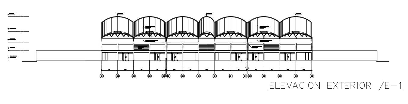 An exterior elevation view of the 160x86m basketball stadium is given in this AutoCAD drawing model. Download now.