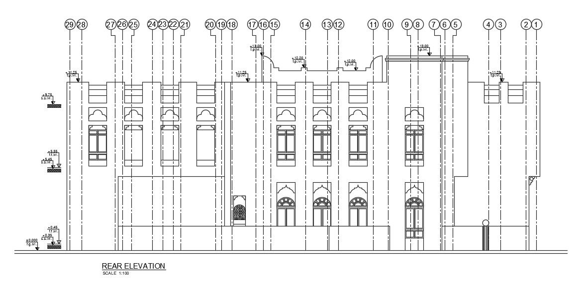 The rear side elevation view of the 31x37m commercial building is given in this AutoCAD drawing file. Download now.