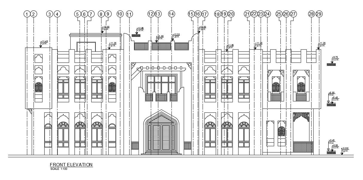 The front elevation view of the 31x37m commercial building is given in this AutoCAD drawing file. Download now.