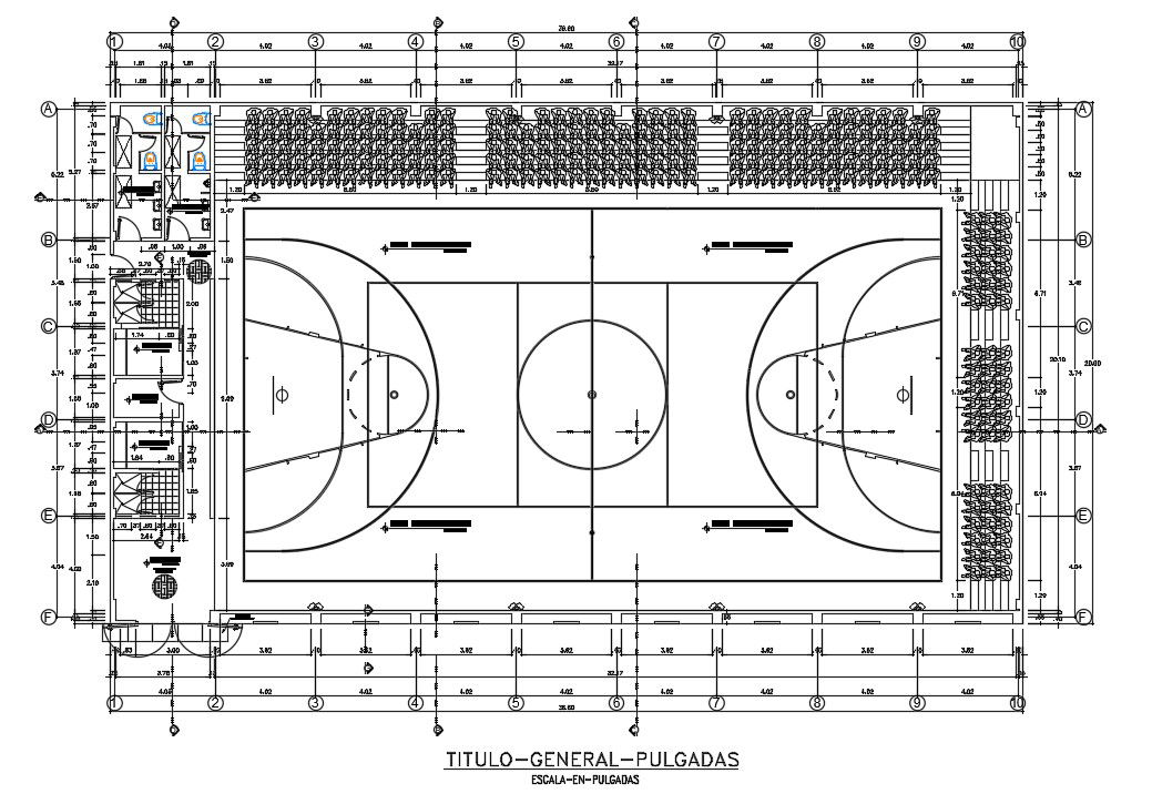 36x21m basketball court stadium plan is given in this AutoCAD drawing model. Download now.