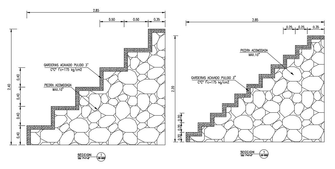 2850mm length of the staircase section view has been given in this AutoCAD drawing model. There are two sizes of staircases given. Measurement details are mentioned in this drawing model. For more details download the AutoCAD drawing file. Thank you for downloading the AutoCAD drawing file and other CAD program files from our website.
