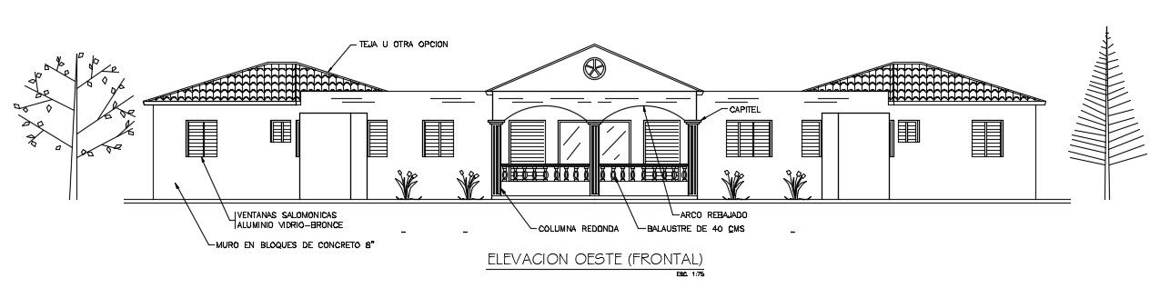 The front elevation view of the 30x30m luxury house building is given in this AutoCAD drawing model. Download now.