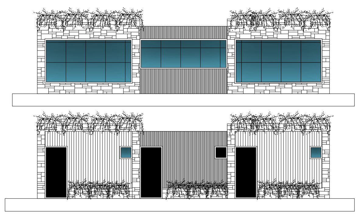 The residence house building single storey floor level building front elevation and rear elevation design, autocad hatching wall, glass window, and garden roofing detail in dwg file. For more details download the AutoCAD drawing file. Thank you for downloading the AutoCAD drawing file and other CAD program files from our website.