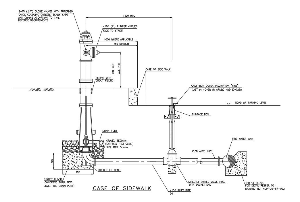 Fire construction detail of sidewalk is given in this AutoCAD drawing model. Pipe connections are given in this model. Drain port, fire water main, surface box, sleeve with grout filling, and pumper outlet are mentioned in this model. For more details download the AutoCAD drawing file. Thank you for downloading the AutoCAD drawing file and other CAD program files from our website.