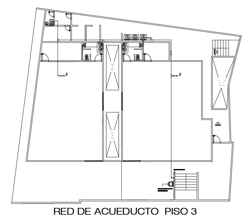 The plumbing layout of the 23x22m second floor shopping center plan is given in this AutoCAD drawing model. Download now.