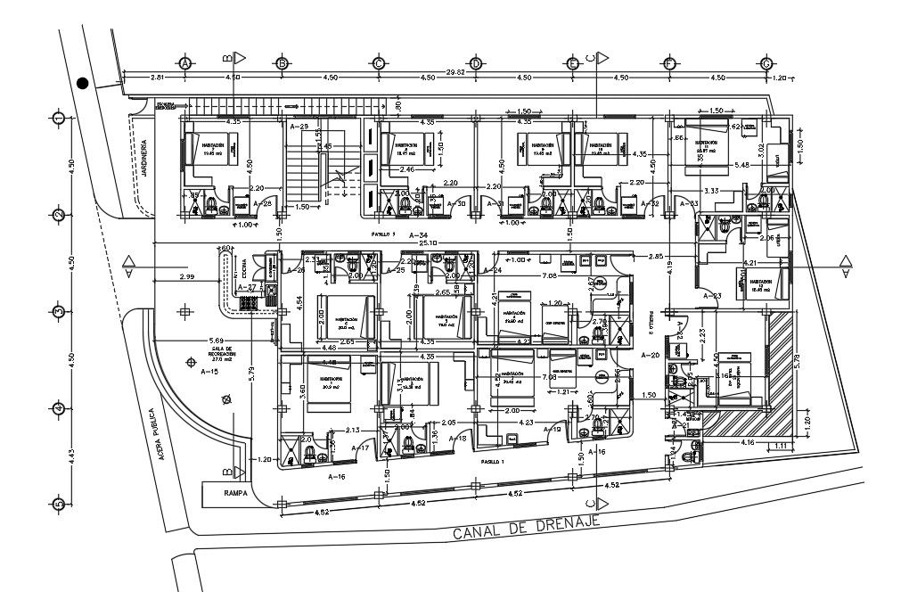 The furniture’s detail of the 30x17m first floor hotel plan is given in this AutoCAD model. This is G+ 1 hotel building. A single cot room with attached toilet, double cot room with attached toilet, bedroom with attached living room & bathroom, and corridors are available. For more details download the AutoCAD drawing file. Thank you for downloading the AutoCAD drawing file and other CAD program files from our website.