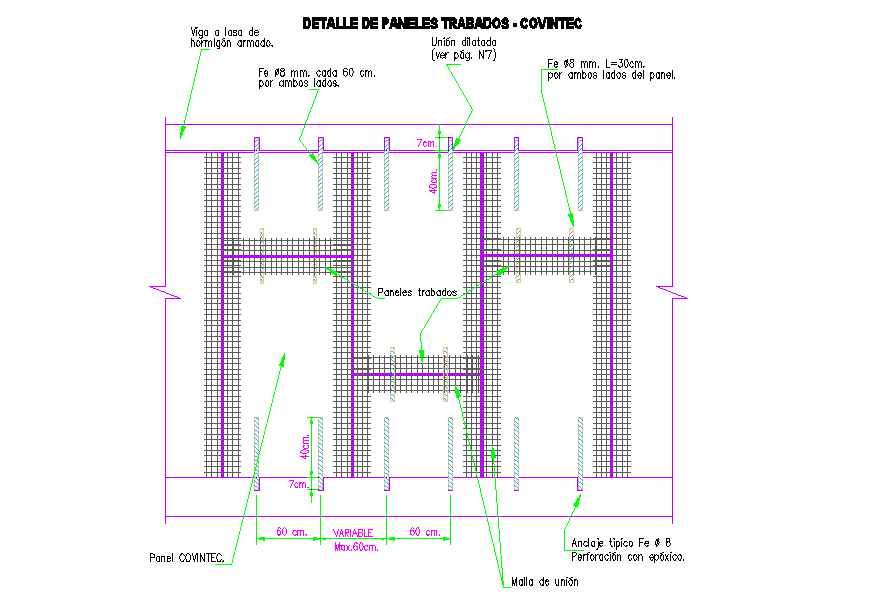 Working panel section Design in dwg file, Bonding mesh, Perforation with epoxy, Fe ∅8 mm. Cada 60 cm On both sides.