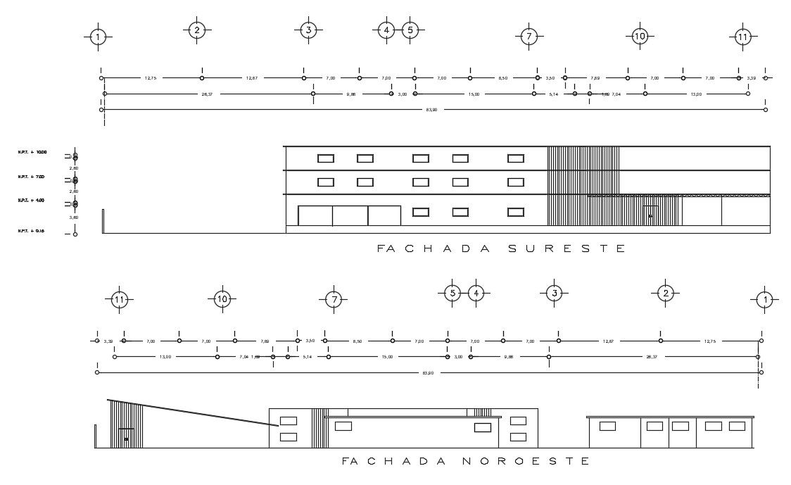 The left & right side elevation view of the 164x84m hotel building is given in this AutoCAD drawing model. Download now.