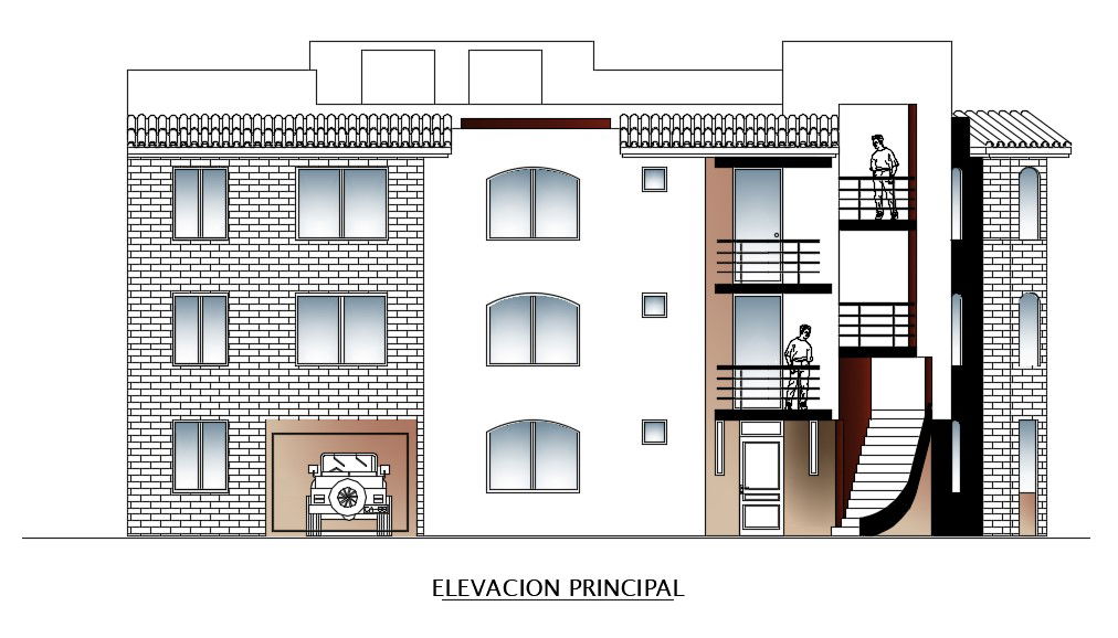 The front elevation view of the 15x13m apartment building is given in this AutoCAD drawing model. Download now.