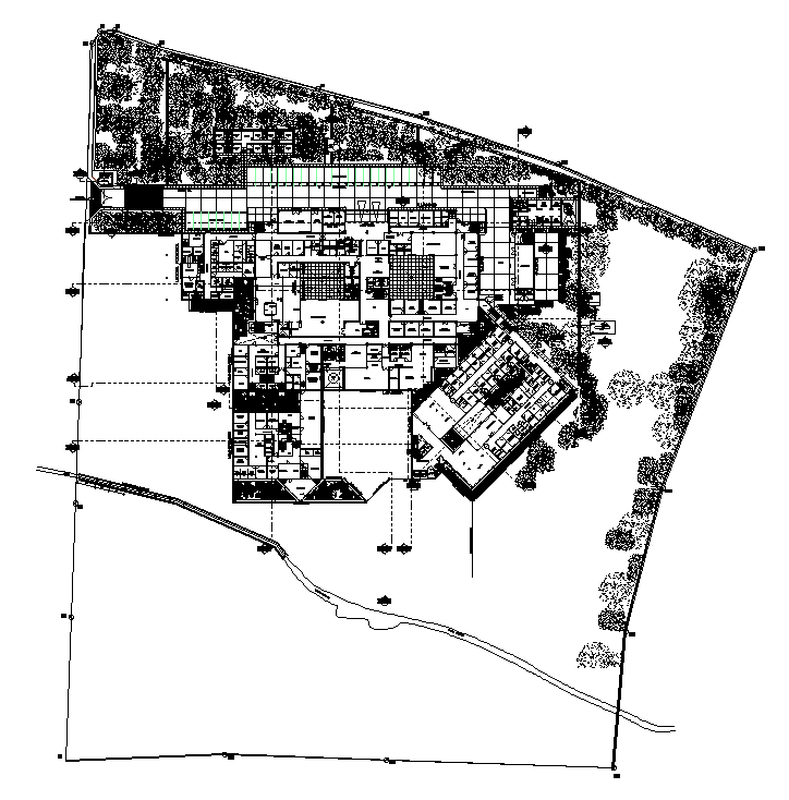 128x108m ground floor hospital plan is given in this AutoCAD drawing model. Download now.