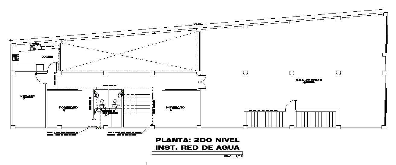 The water line layout of the 34x10m second floor house plan is given in this AutoCAD drawing model. Download now.