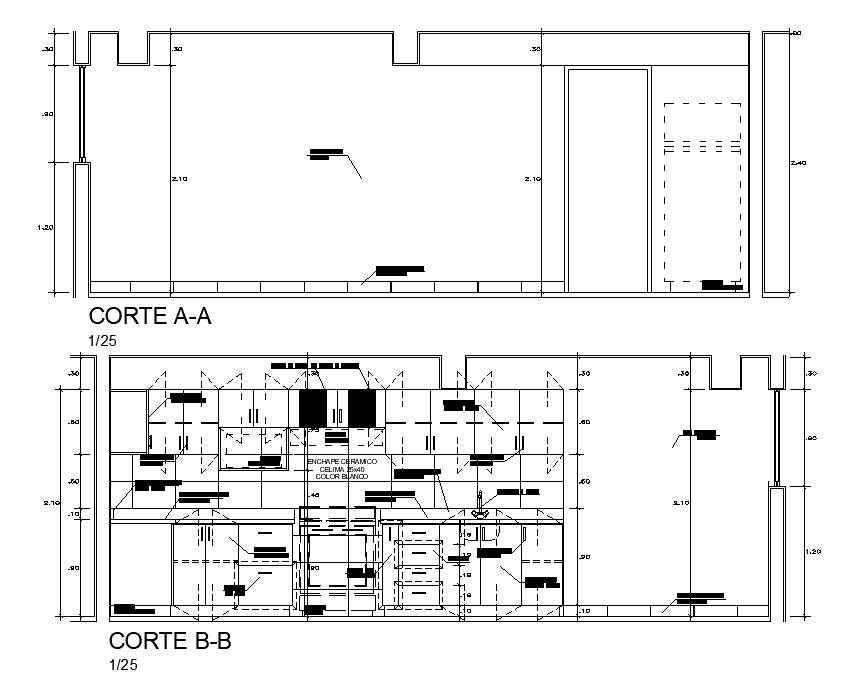 A section view of the 1900x5700mm kitchen is given in this AutoCAD drawing model. The height of the kitchen building is 2.4m. A section view of the kitchen is given. A dining area, refrigerator location, table, oven location, sink, shelves, gas burner, and washbasin are mentioned on this plan. For more details download the AutoCAD drawing file. Thank you for downloading the AutoCAD drawing file and other CAD program files from our website.