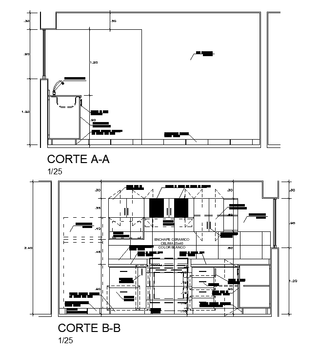 The left side section view of the 3150x3000mm kitchen is given in this AutoCAD drawing model. The height of the kitchen is 2.4m. Refrigerator location, table, oven location, sink, shelves, gas burner, and washbasin are mentioned on this plan. For more details download the AutoCAD drawing file. Thank you for downloading the AutoCAD drawing file and other CAD program files from our website.