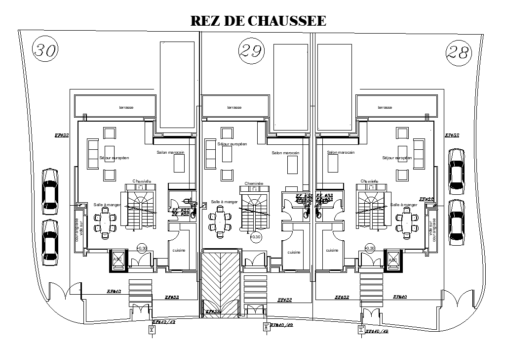 A site layout of the 32x13m row villa house plan is given in this AutoCAD drawing model. Three houses are available on this plan. Car parking, kitchen, dining area, living room, and common bathroom are available. For more details download the AutoCAD drawing file. Thank you for downloading the AutoCAD drawing file and other CAD program files from our website.