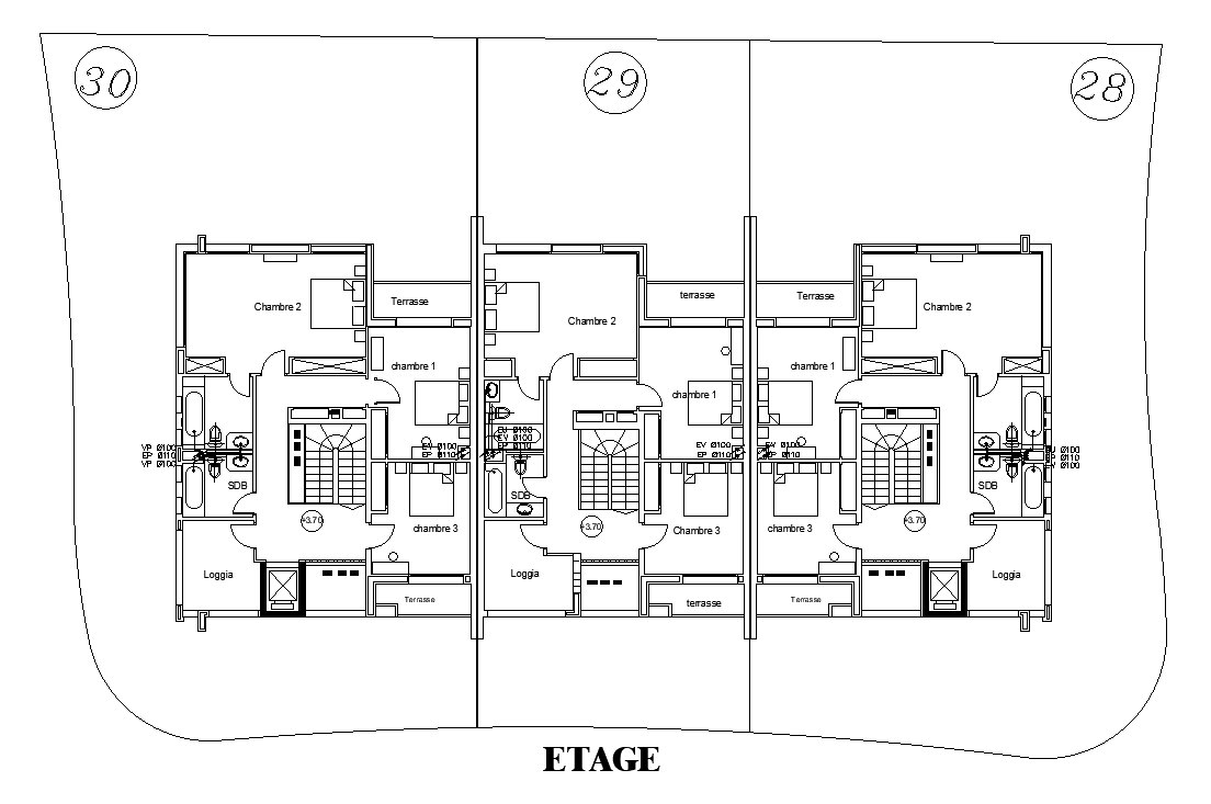 32x13m first floor row villa house plan is given in this AutoCAD drawing model. Three houses are available on this plan. Family lounge area, master bedroom with attached bathroom, kid’s room, guest room, and common bathroom are available on the first floor. For more details download the AutoCAD drawing file. Thank you for downloading the AutoCAD drawing file and other CAD program files from our website.