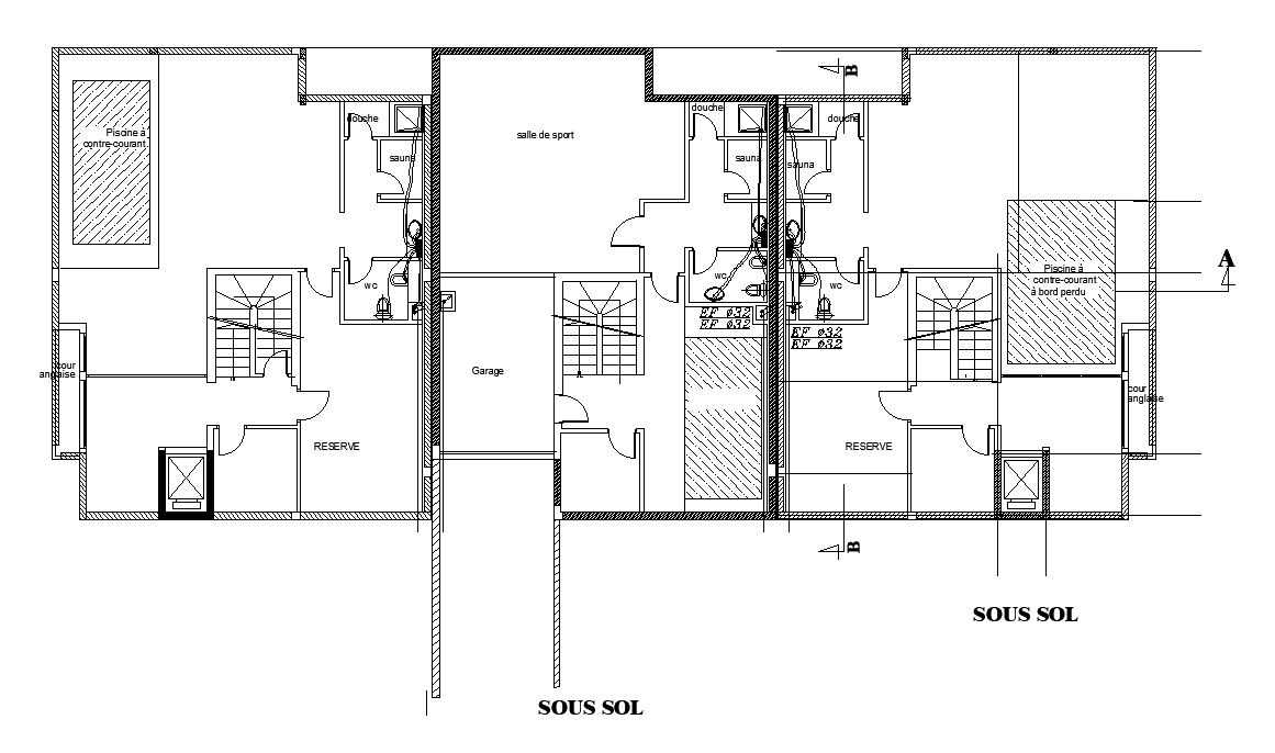 The plumbing layout of the 32x13m ground floor row villa house plan is given in this AutoCAD drawing model. Download now.