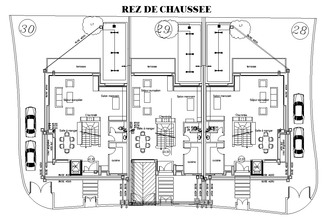 32x13m ground floor row villa house plan is given in this AutoCAD drawing model. Three houses are available on this plan. A kitchen, dining area, living room, and common bathroom are available. For more details download the AutoCAD drawing file. Thank you for downloading the AutoCAD drawing file and other CAD program files from our website.