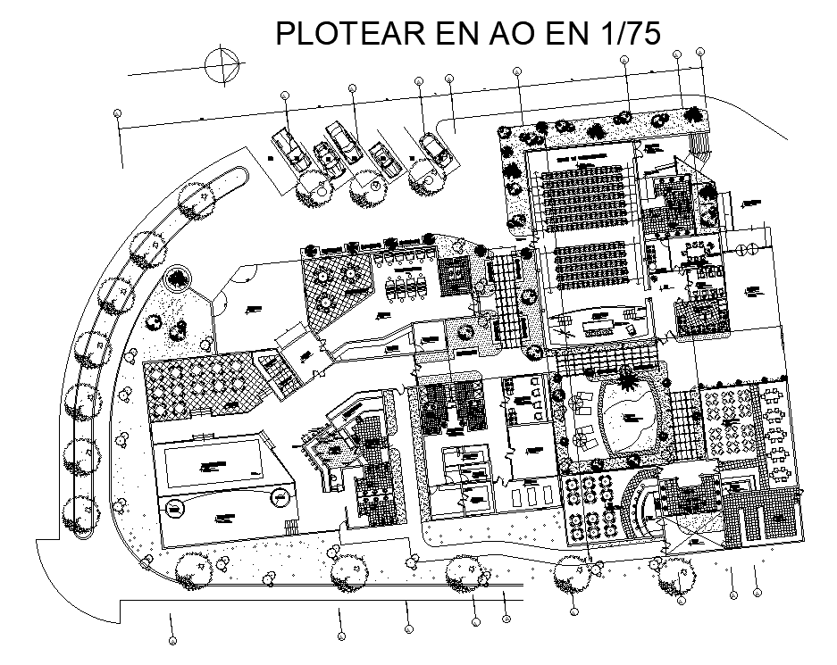 The left side portion of the 126x54m hotel plan is given in this AutoCAD drawing model. This is single story hotel building. Staying room with attached toilet, passage, garden, car parking, office, restaurant, bar, kitchen, service area, reception, massage room, gent’s toilet, ladies toilet, aerobics, dining area, and play areas are available on this plan. For more details download the AutoCAD drawing file. Thank you for downloading the AutoCAD drawing file and other CAD program files from our website.