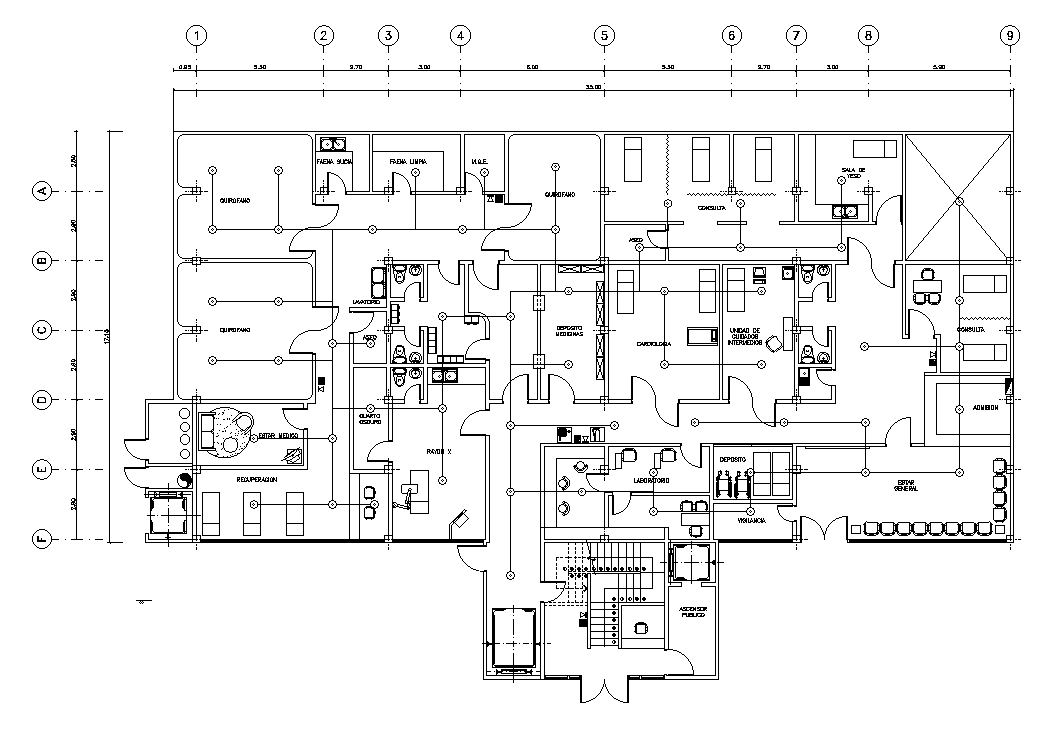 The light fitting detail of the 35x18m hospital ground floor plan is given in this AutoCAD drawing model. Download now.